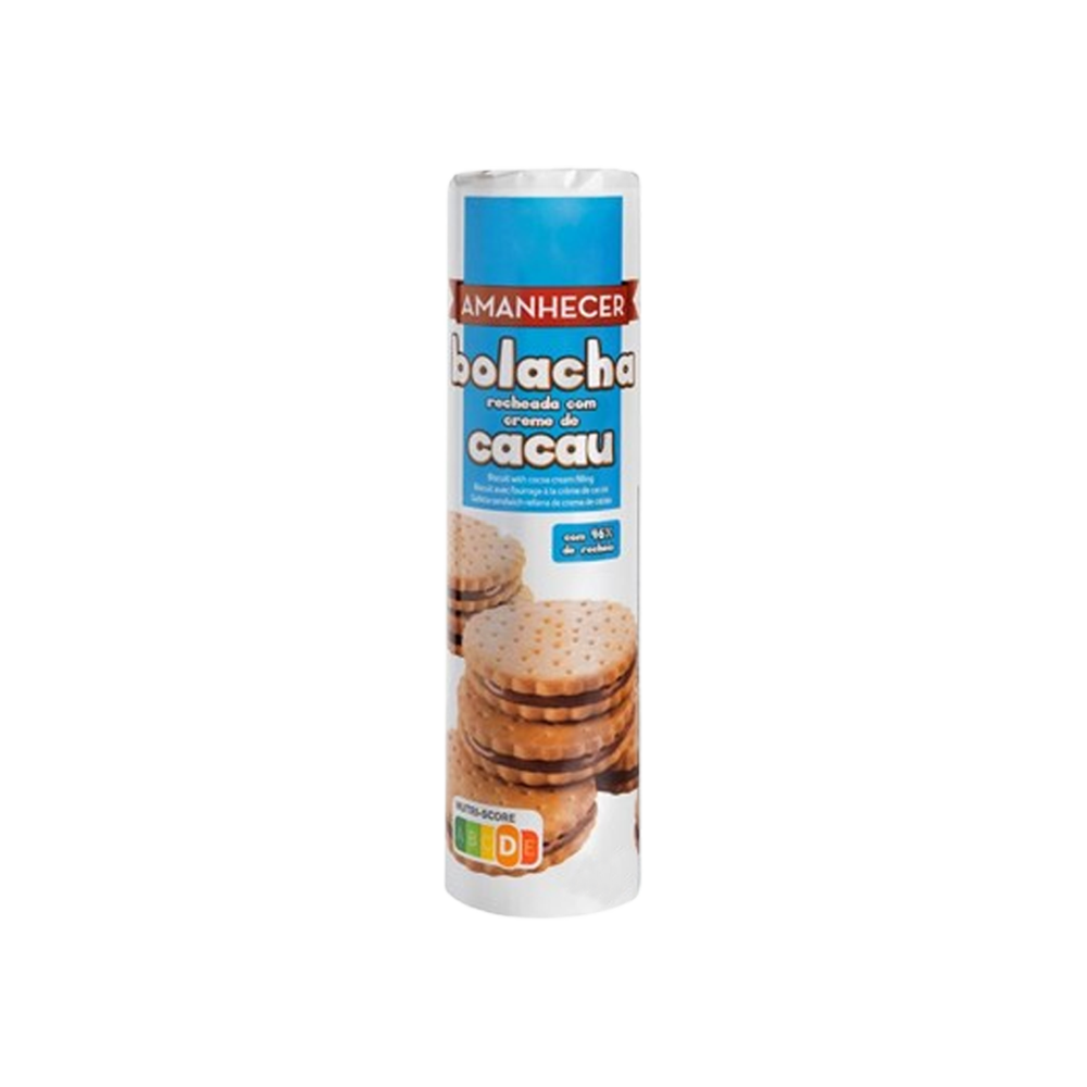 As Bolachas Recheadas Amanhecer com creme de cacau são uma opção clássica e saborosa para toda a família. Crocantes por fora e com um recheio cremoso de cacau no interior, são ideais para acompanhar um copo de leite, café ou chá. Uma escolha prática e económica para lanches e momentos de partilha.
