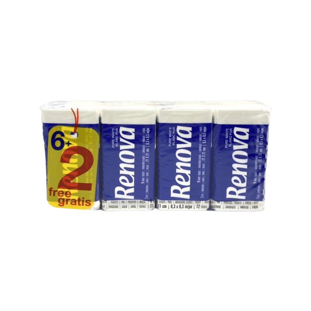 Os Lenços de Bolso Renova 6+2 grátis são ideais para o dia a dia, combinando suavidade, resistência e praticidade. Compactos e fáceis de transportar, são perfeitos para manter a higiene em qualquer lugar. Cada embalagem contém 8 maços de lenços triplos, com textura suave para maior conforto ao contacto com a pele.