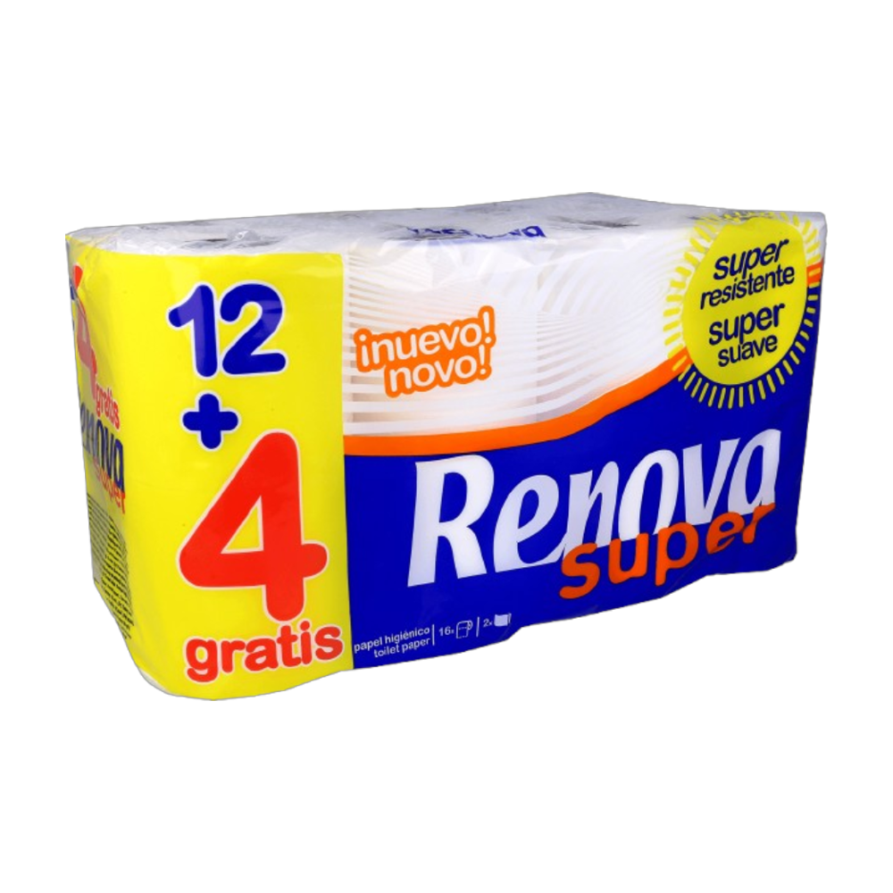 O papel higiénico Renova Super oferece uma combinação de suavidade e resistência para o seu conforto diário. Este pacote promocional inclui 12 rolos mais 4 rolos grátis, perfazendo um total de 16 rolos, ideal para garantir o stock em casa por mais tempo.
